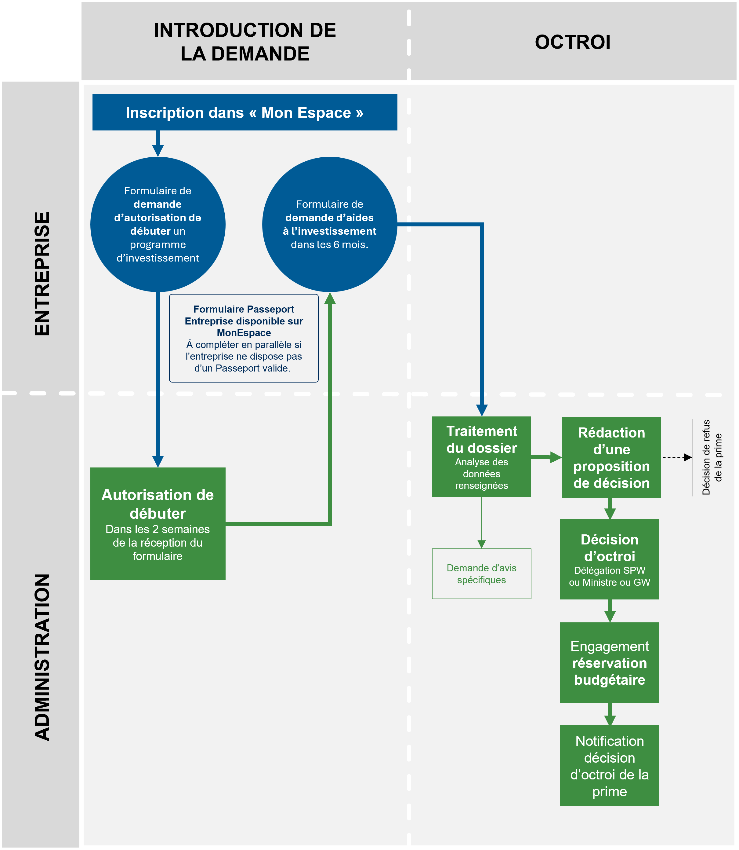 Votre demande de "Passeport Entreprise" doit être complétée via un formulaire en ligne disponible sur "Mon Espace". Lorsque vous validez la demande, vous recevez un accusé de réception par courriel mentionnant un numéro de référence. - Vous devez compléter le formulaire de demande d'aides à l'investissement, au plus tard 6 mois à dater de l’autorisation de débuter. Vous y indiquez le numéro de référence ou la décision du "Passeport Entreprise".